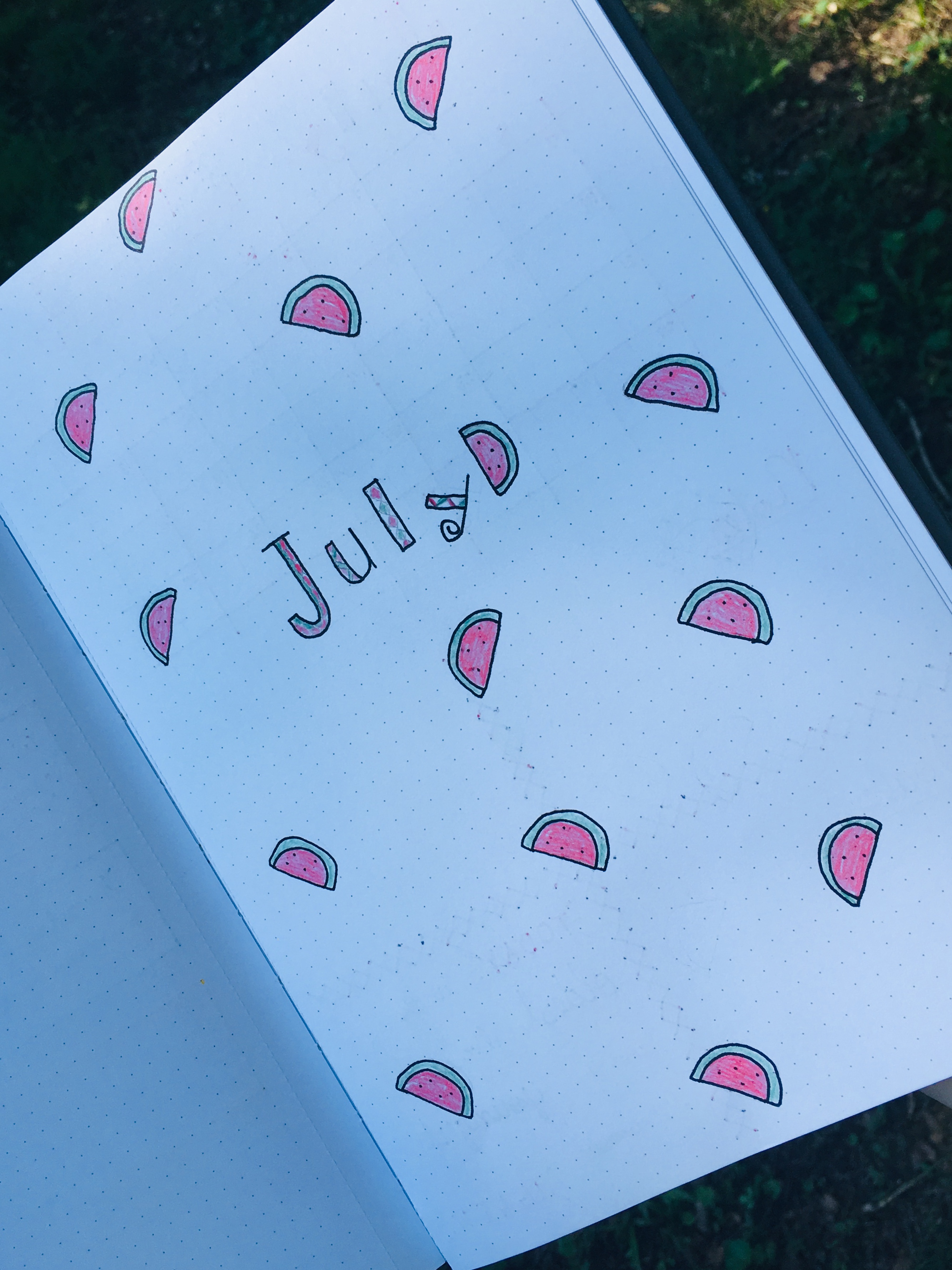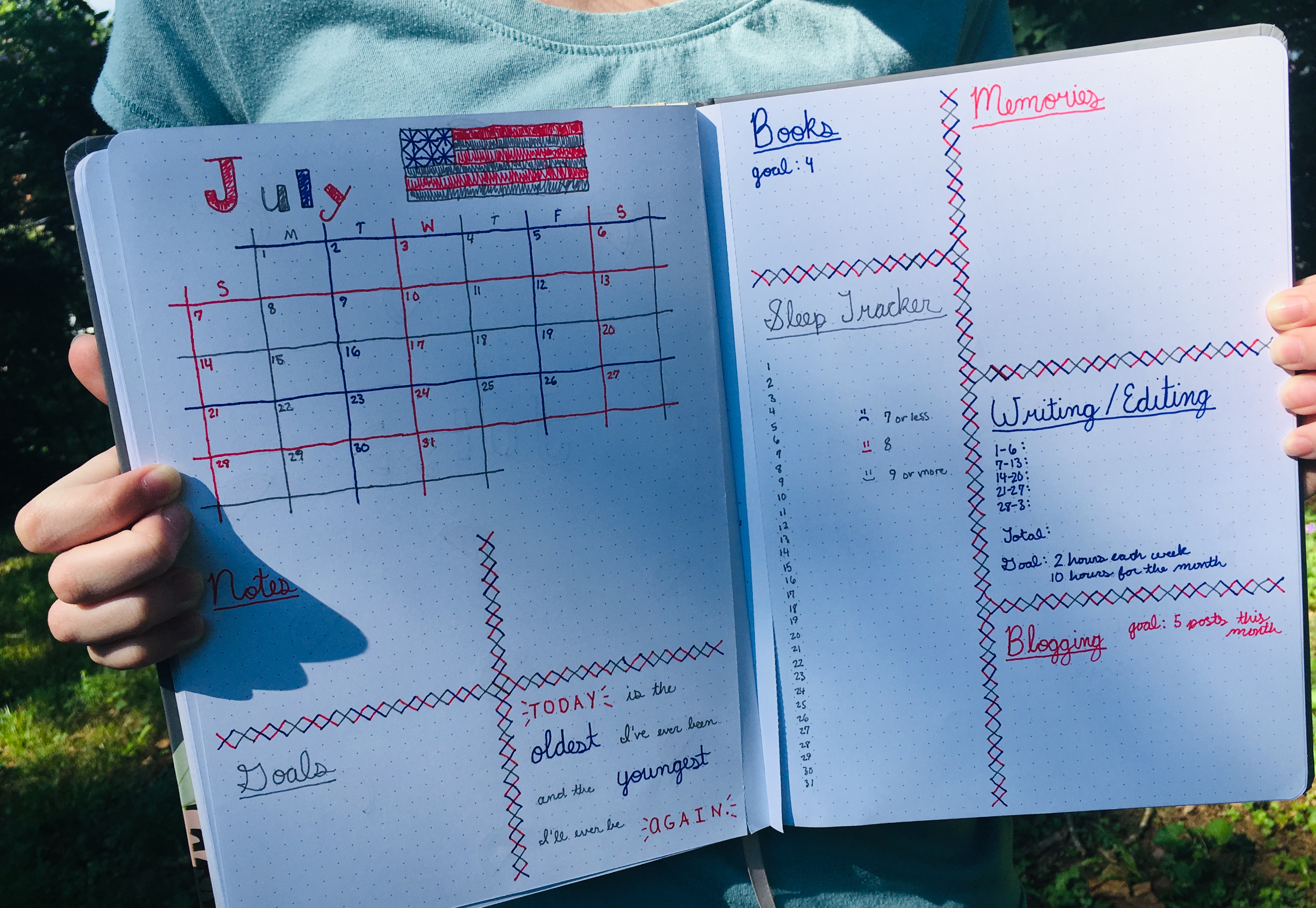 The picture you saw at the top of the post was my title page, and if you can’t tell, the two themes for this month are watermelons and patriotic colors. I found the watermelon idea on Pinterest, and I decided to also do some red, white (or in this case, gray), and blue since July fourth is coming up. The picture above is my monthly overview. On the left page, I have my calendar, notes section (to mark down special events), goals section, and a quote (also found on Pinterest). On the right page, I have my books section (where I write down what books I’ve read), memories section (where I jot down special things I want to remember), sleep tracker, writing section (where I record how much time I spend writing each week), and blogging section.