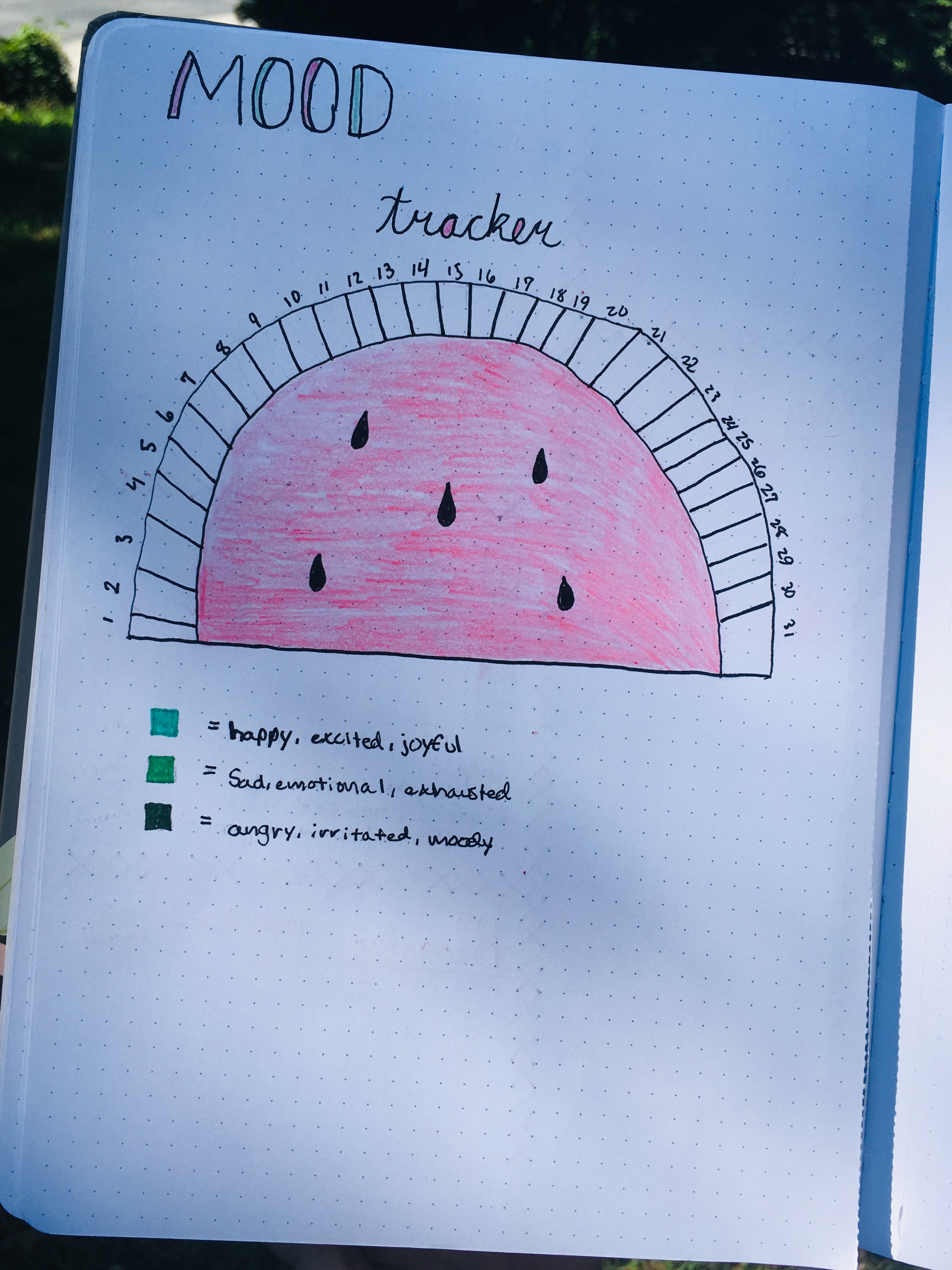 This is my mood tracker, and I came up with this idea on my own (amazing, right?). I am not the best artist, but I’m working on it. I combined all the moods I could think of into three categories, and then I can choose a color according to the moods I felt most and color in the correct section of the watermelon rind.