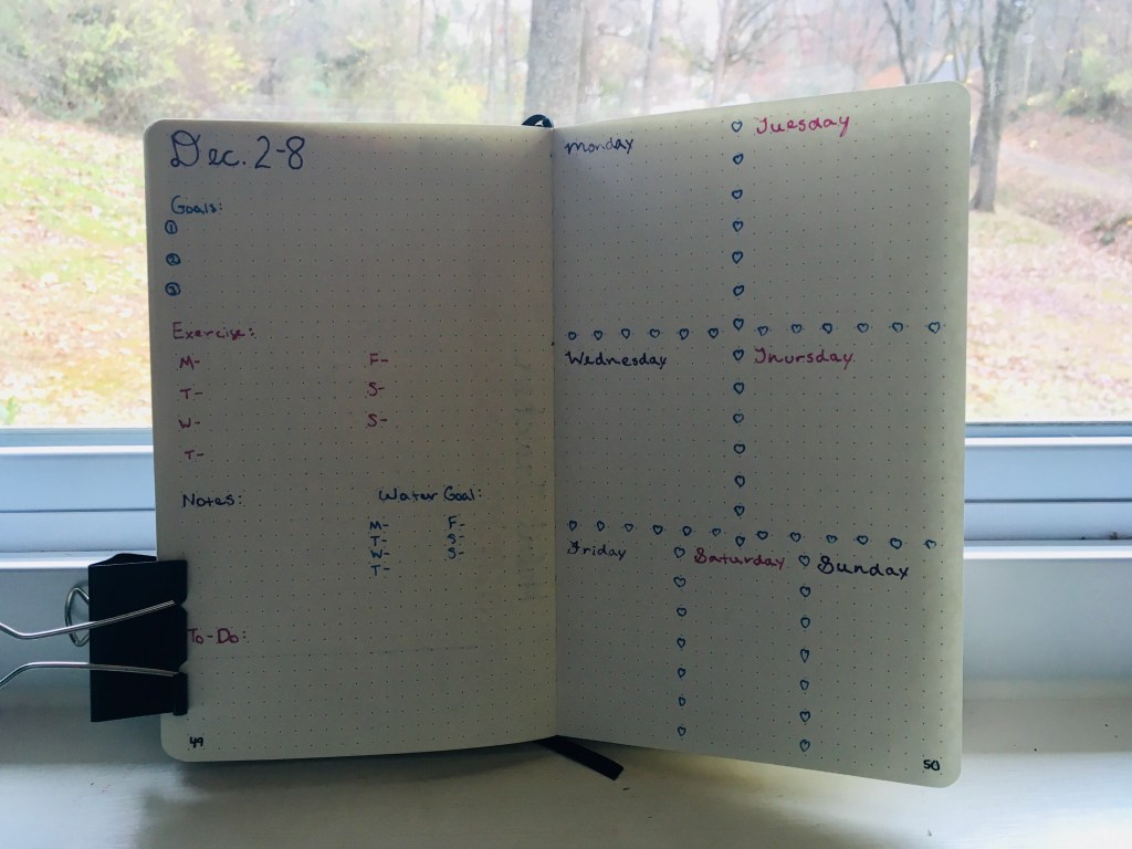 Finally, here is my weekly layout. I did this in gel pen because I couldn’t come up with any color schemes that I hadn’t used on my regular pens and I had a lot more colors to choose from with my gel pens. The left page has all of my extra information and the right page contains all of the daily sections. At the top of the left page, I have a section for my goals. I’ve decided to start doing three goals for each week as well as the ones for the entire month. Underneath that is a section to record all of the exercise that I do during the week. The section below that is divided in two- one for extra notes and one for my water tracker. Finally, I have my to-do list at the bottom of the page.