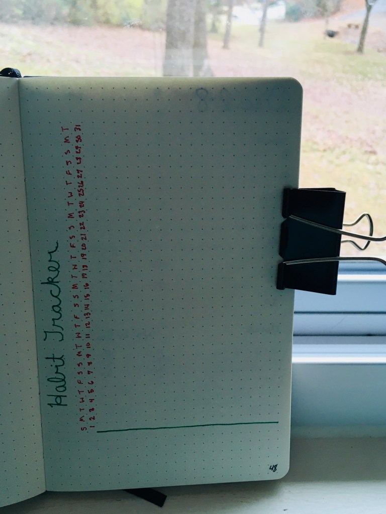 Here is my Habit Tracker for this month. It’s the same as always: dates are written at the top, and on the side of the green line is where I will write my habits.