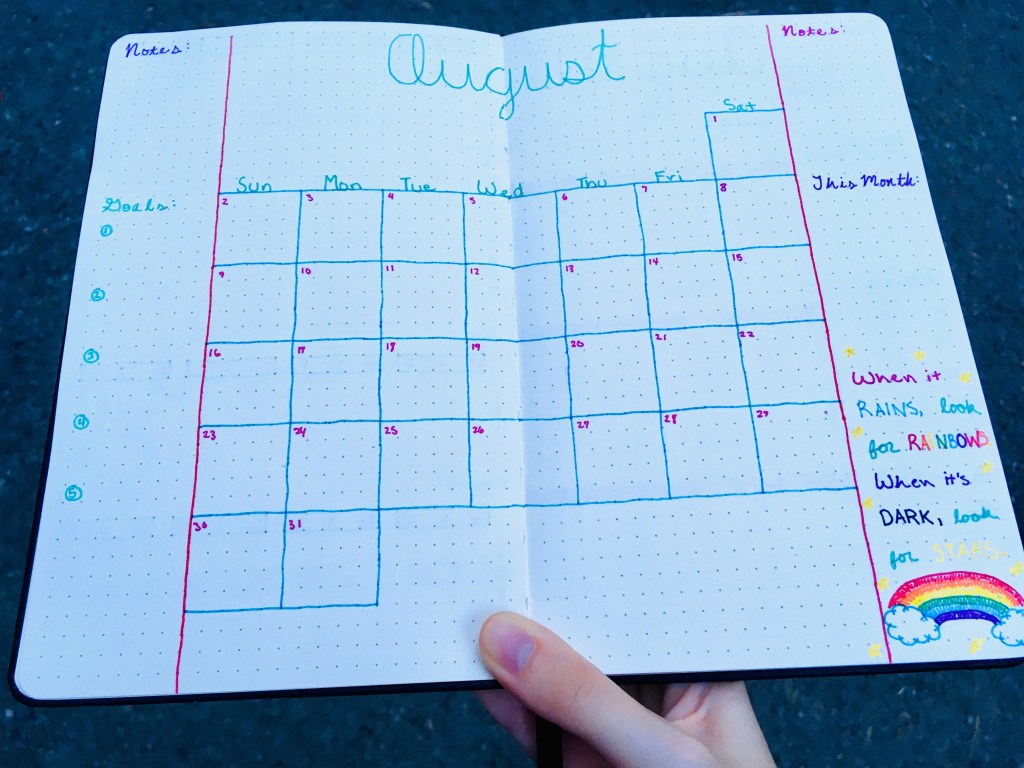 For my first August page, I have my calendar. On these pages, I also have spaces for notes, goals, and events that will happen during the month. Also, I’ve written out one of my favorite quotes: “When it rains, look for rainbows. When it’s dark, look for stars.” I don’t know who came up with that quote, but thank you.