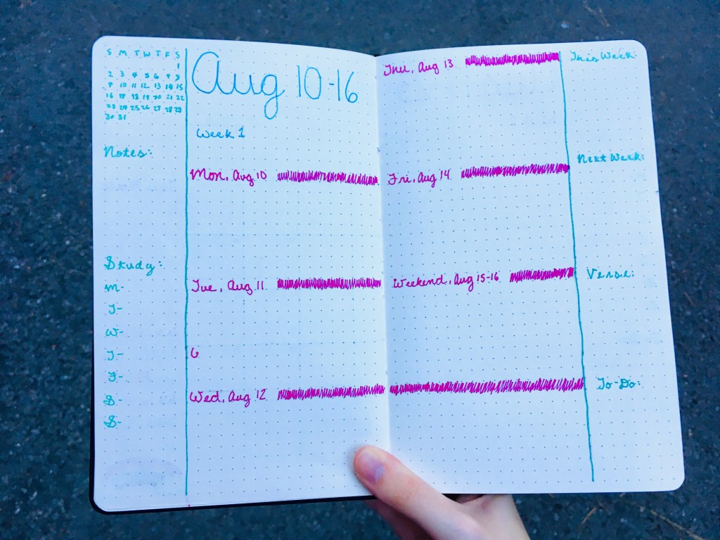 And now I start my weekly spreads. Each spread has spaces for each day, a mini-calendar, notes, study plans, events happening during the week and next week, a space to write out my memory verse, and a space for to-dos.