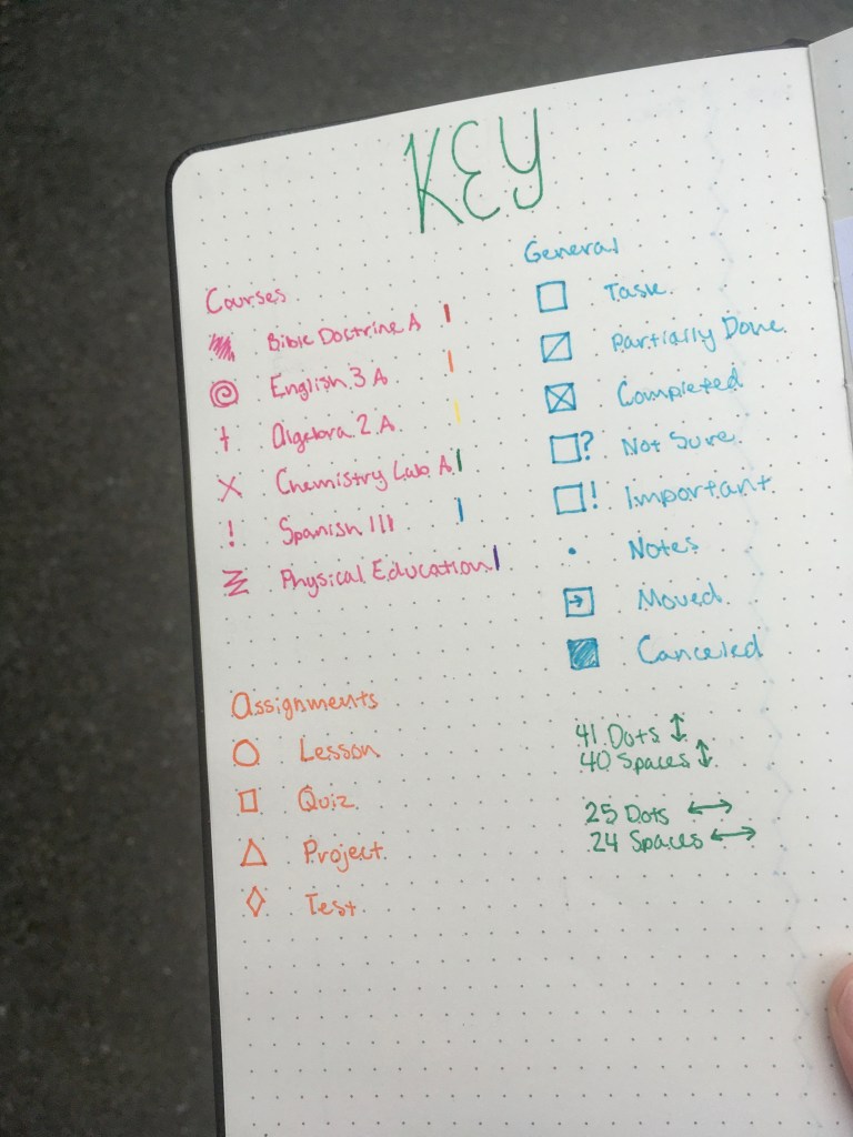 Here I have my key. I’ve listed all of my courses and assigned different symbols for each one. I did end up changing it a little later on, so that’s why there’s also color tallies next to each course. I also have symbols for each type of assignment that my school does: lessons, quizzes, projects, and tests. In blue I’ve listed my key for tasks and events. Below that, I’ve written down how many dots and spaces are on each row vertically and horizontally.