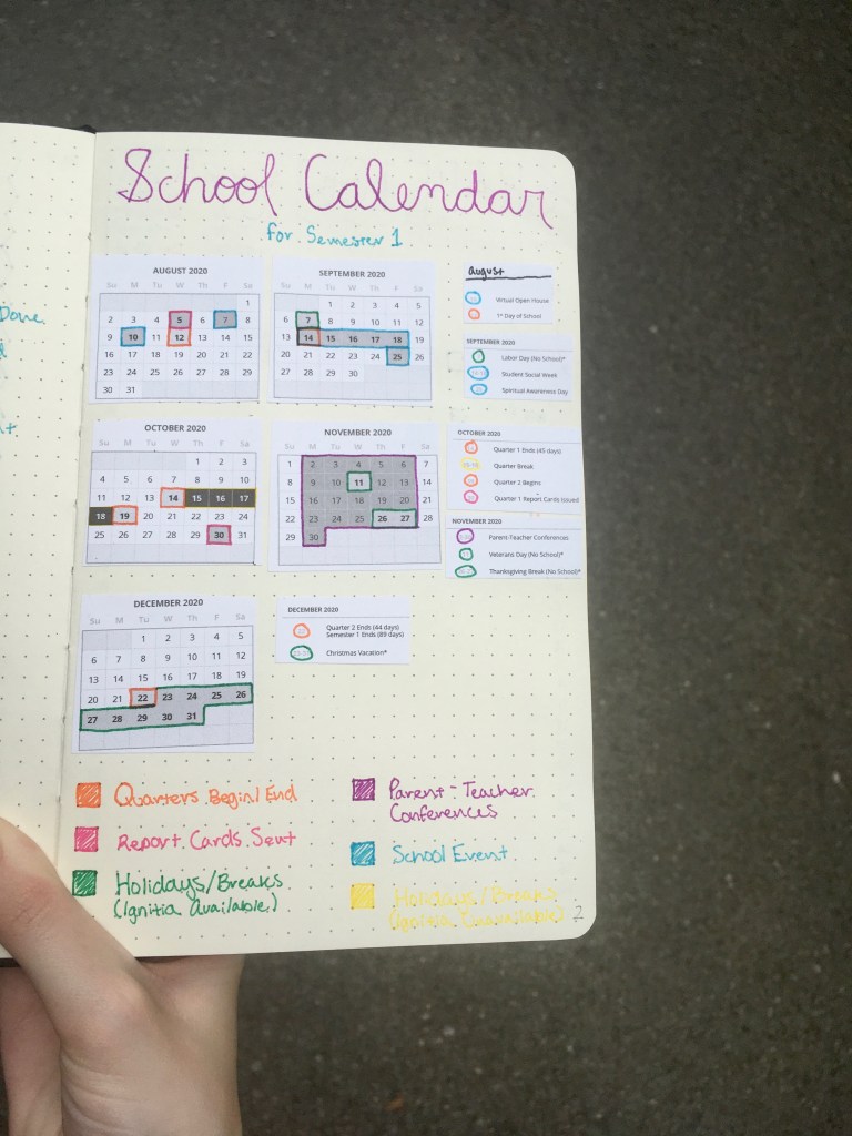 This is my calendar for the year. It has all of my school events listed on it. For this page, I actually just cut out and glued on all the parts from a paper I printed off from my school website. I thought it would be easier to do that instead of writing out all of the events. I also color coded each type of event at the bottom on the page.