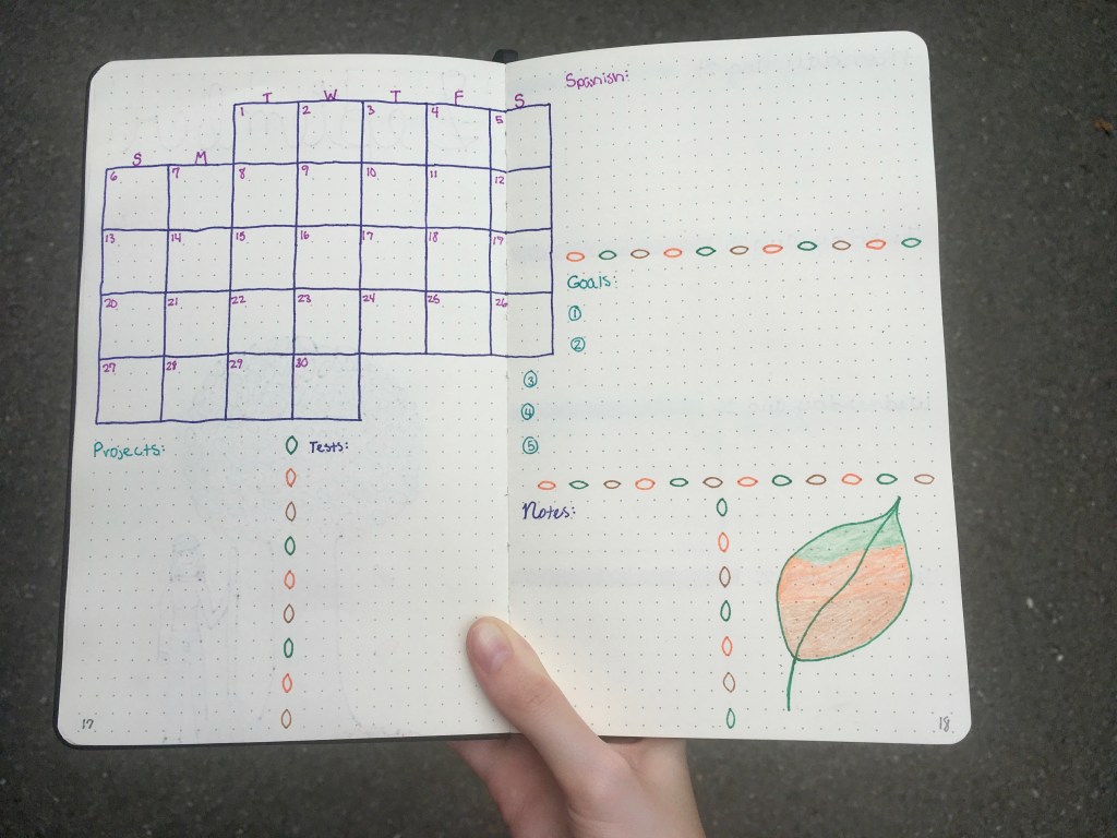 This month’s calendar is different from last month’s. I decided to downsize my calendar and leave more space for other things. On this page, I have spaces for projects I have during the month, tests I have, my Spanish plan, goals, and notes.
