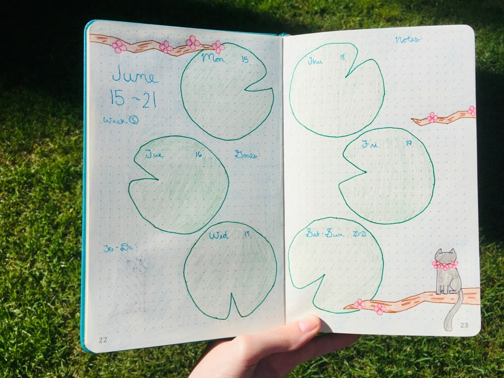 This spread was for the week of June 15-21, and I really like the way this one turned out! It’s supposed to look like a pond with lily pads as the daily sections, and branches kind of hanging over the water. This was probably my favorite weekly spread this month.