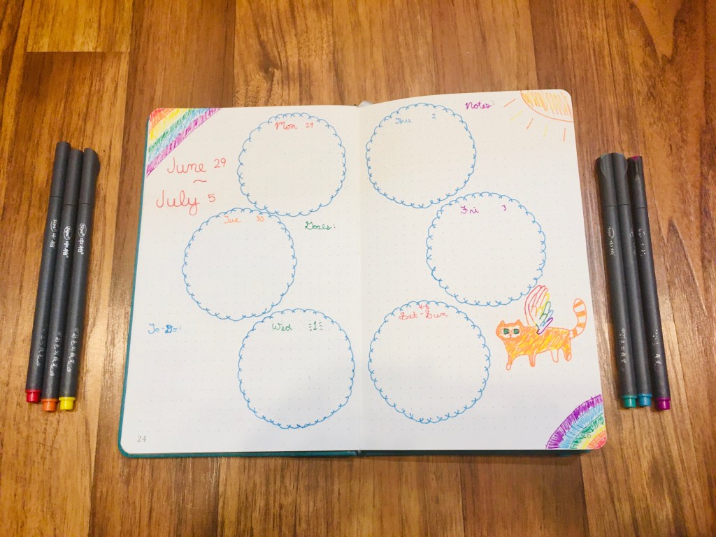 This spread was for June 29-July 5 and is sky themed. The daily sections are clouds, and there’s also a rainbow, a sun, and a flying cat (I wanted to incorporate a cat in some way, so I added wings to it. Looking back, it seems kind of weird, but I can’t change it now…).