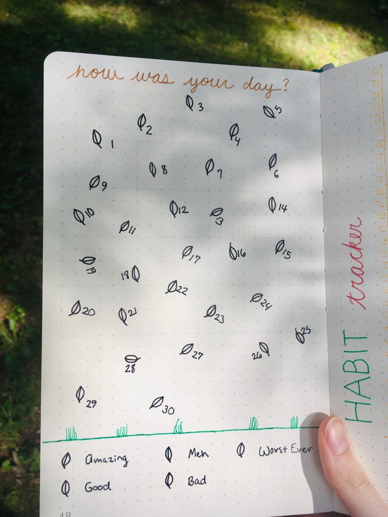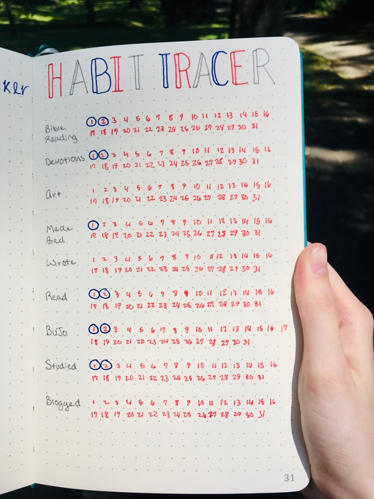 Finally, I did my habit tracker. This habit tracker is different than the ones I’ve done in the past, but it’s pretty self-explanatory. The habits are written on the left, and if I’ve completed a habit, I’ll circle the date.
