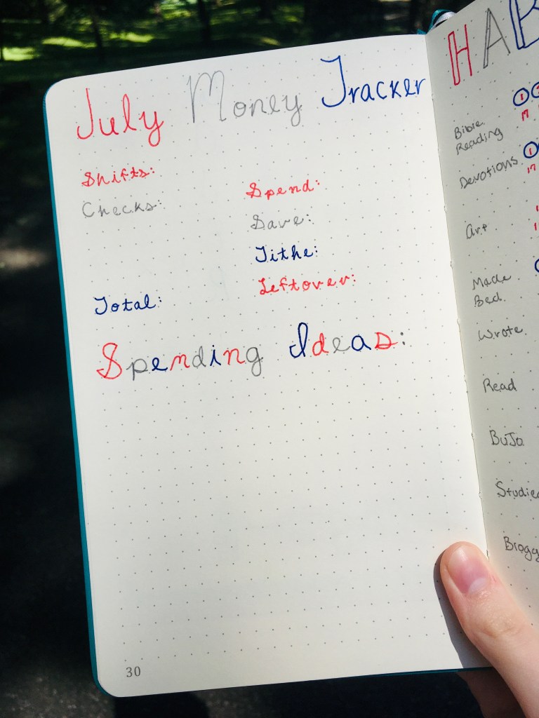 Here I have my money tracker, which is the same as always. I’ll do tally marks for how many shifts I work, write down my checks, and the total amount of money I earned. I’ll divide that money into spend, save, and tithe money and record it. I’ve also saved a space for spending ideas.