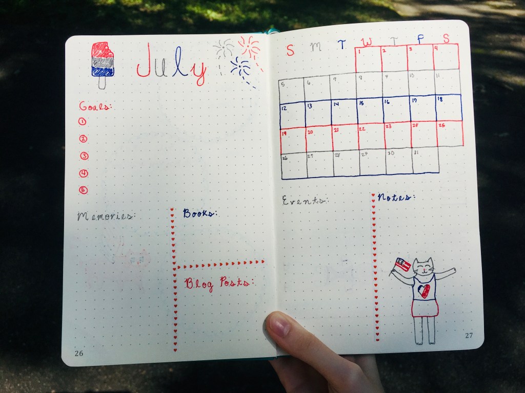 First off, I have my July Monthly Overview. On the left page, I have a red, white, and blue themed popsicle and also fireworks (I used gray as a substitute for white). Next I have sections for goals, memories, books I read, and blog posts. On the right page, I have my calendar and spaces for events and notes. I also added a cat waving a USA flag to celebrate the Fourth of July.