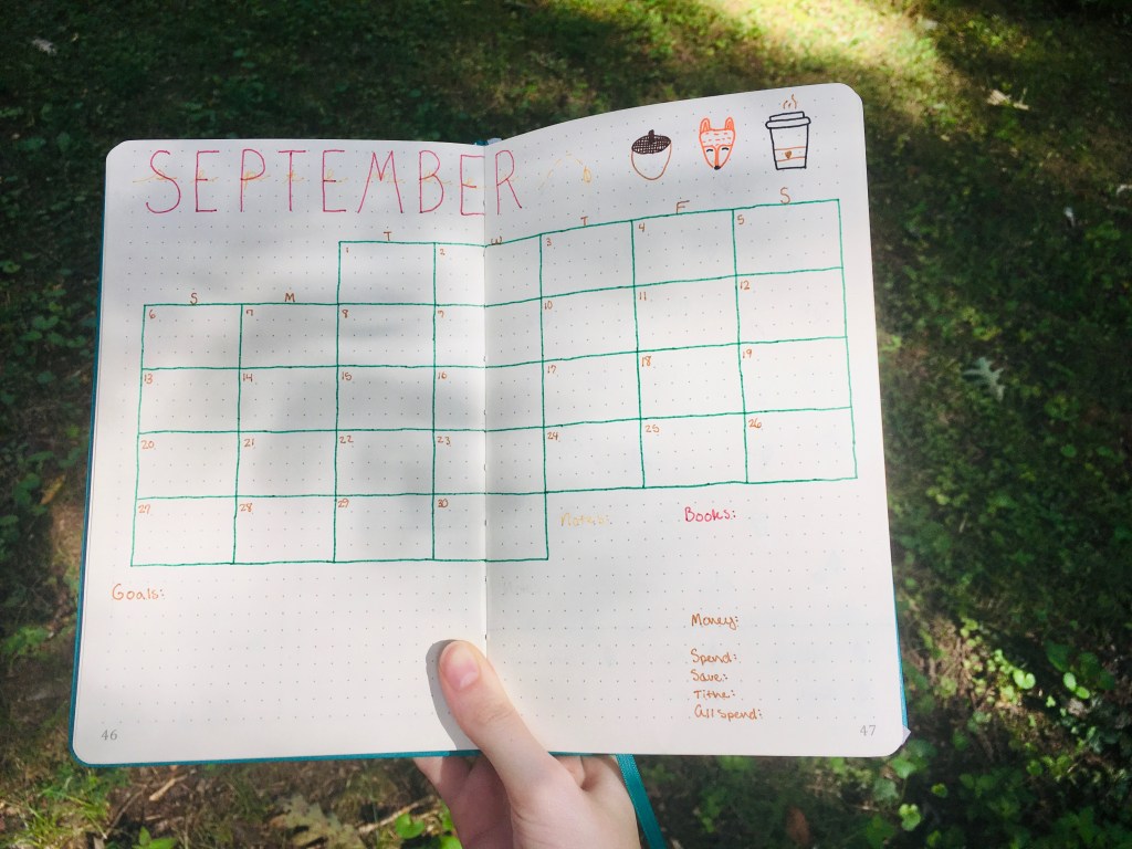 Above is a picture of my monthly page for September. It includes a calendar, some doodles, and spaces for goals, notes, books I will read during the month, and my money tracking.